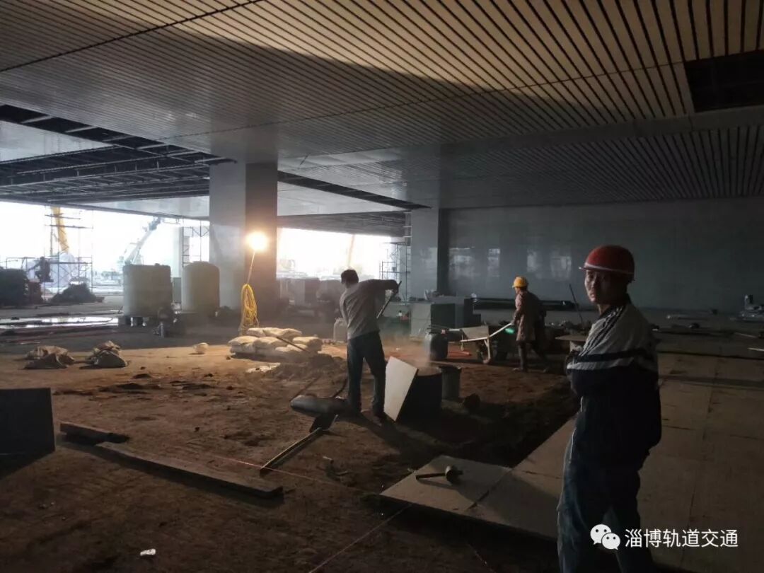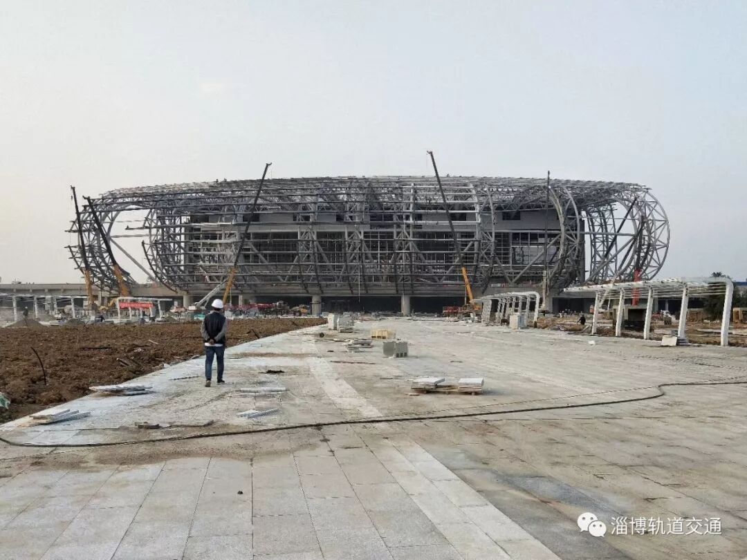 淄博北站正处于全面施工状态。硕大的金属航架包裹着站房,远远望去,淄博北站的“舱体”外形已经展现在眼前,多名工人正在站前广场施工。据观察,站前广场的南北两侧两侧各建有一条弧形通道,在通道边共建起了5处钢结构凉亭,地下停车场的施工进展顺利。