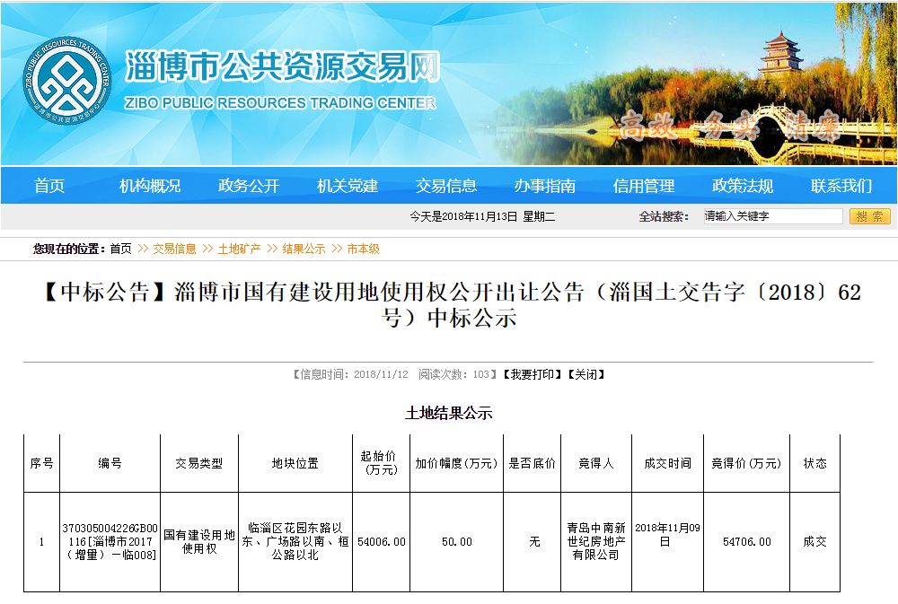 11月12日青岛中南新世纪房地产有限公司以5.4706亿元的总价成功摘得临淄区一宗优质地块,临淄新地 王诞生!