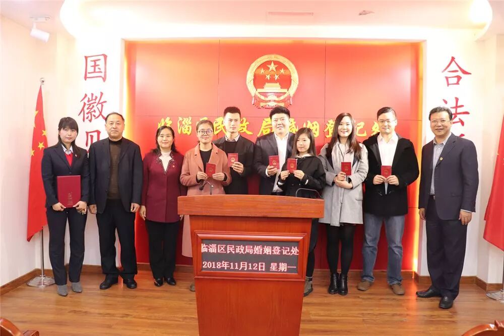 市妇联主席马召芹、市民政局副局长陈晶、临淄区委副书记卢华栋为新人颁证