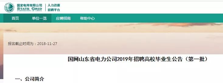 2.填报应聘单位。招聘公告发布之日起,应聘毕业生可在招聘平台填报应聘单位。报名时间于2018年11月27日截止,届时报名系统将自动关闭。公司优先组织第一志愿报考国网山东省电力公司的毕业生参加招聘考试。