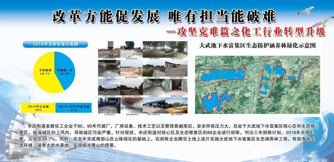 辛店街道多数化工企业于80、90年代建厂,厂房设备、技术工艺以及管理普遍落后,安全环保压力大,且处于大武地下水富集区核心区和生态修复区,临淄城区的上风向,导致城区污染严重。针对现状,辛店街道对核心区及生态修复区的88企业进行拆除,列出三年拆除计划。2018年关停43家,占全区59.7%。同时,在去年完成南部山区山体绿化的基础上,在拆除企业腾空土地上连片实施大武地下水富集区生态涵养林工程,有效净化生态环境、涵养大武水源地,还百姓绿水青山。