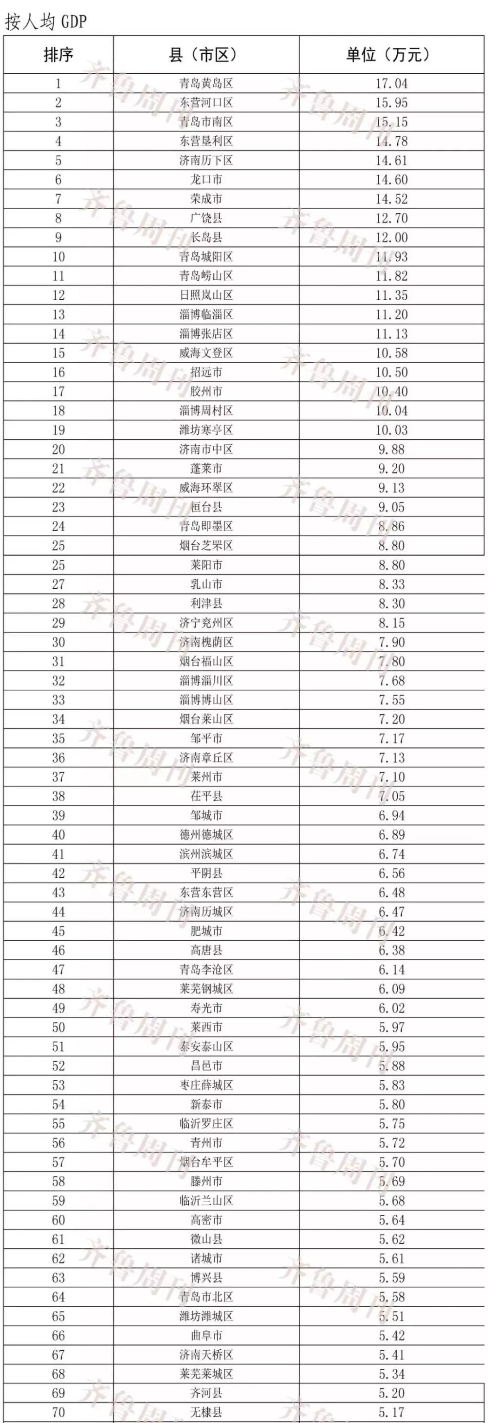 前三季度人均GDP前十名为青岛黄岛区、东营河口区、青岛市南区、东营垦利区、济南历下区、龙口市、荣成市、广饶县、长岛县、青岛城阳区。临淄区、张店区和周村区分列排行榜的13、14和18位。