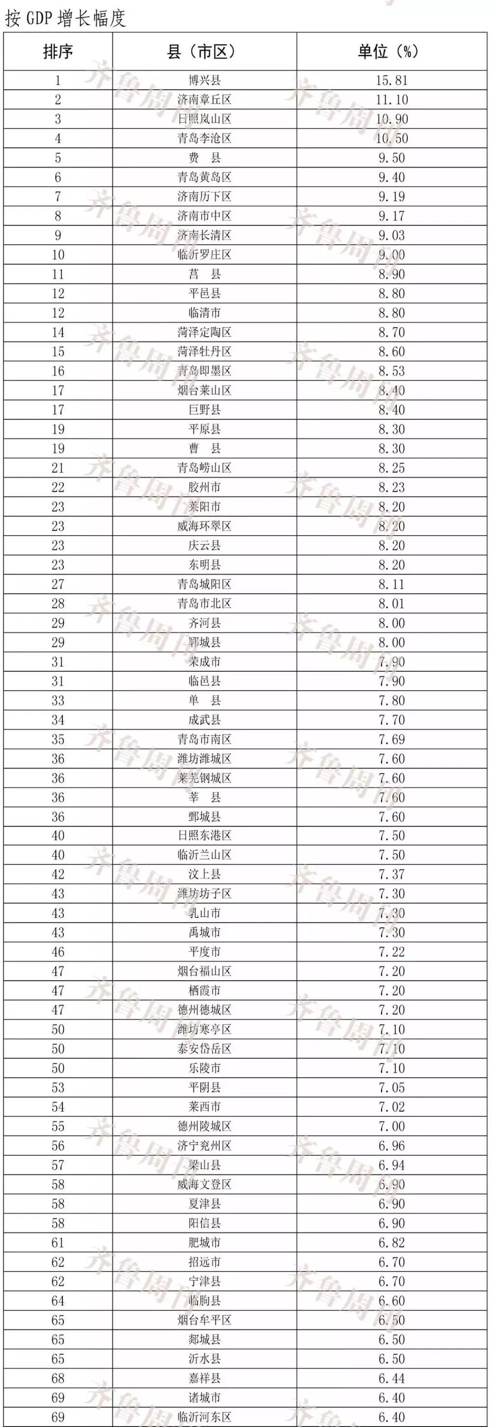 前三季度GDP增长幅度前十名,为博兴县(15.81%)、济南章丘区(11.10%)、日照岚山区(10.90%)、青岛李沧区(10.50%)、费县(9.50%)、青岛黄岛区(9.40%)、济南历下区(9.19%)、济南市中区(9.17%)、济南长清区(9.03%)、临沂罗庄区(9.00%)。此外,滨州沾化区、惠民县、济南济阳区、邹平市GDP负增长。