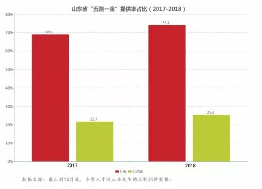 以上是2017年和2018年山东省“五险一金”提供率占比分布图,可以清楚地看到目前山东省的提供率及同期涨幅变化。